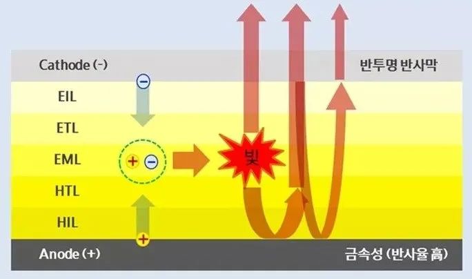 通過這種方式,可以將光效率提高約1.5倍至2倍。 利用干涉和共振的自然現象,可以調節發光物體的厚度、折射率和反射率,改善所需波長的光學特性或畫質特性,而OLED充分利用了這個原理。