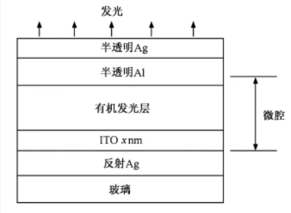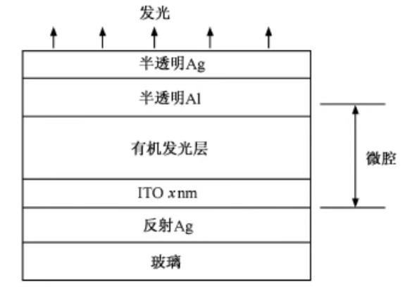 光學微腔是把發光區置于一個全反射膜和半反射膜構成的諧振腔內,由于有機發光器件的厚度可與光波長相當,半透明復合陰極可看成半反射膜,再加上全反射陽極,因而器件具有微腔效應。