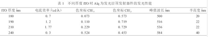 由上表可知,隨著ITO的厚度變化,器件的電流效率發生較大的變化,這是由于發光峰值的不同而引起,