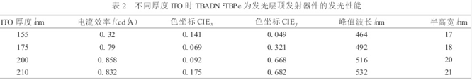 當ITO厚度為155nm時,可得到發光峰值為464nm,色坐標為x=0.141,y= 0.049的深藍色頂發射器件.