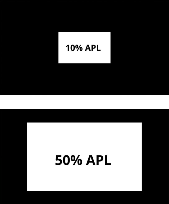 例如,在黑色背景下,打開測量不同大小的純白色矩形圖片的亮度。當(dāng)白框是整個圖像大小的四分之一時,就模擬了25%的APL。半個屏幕將是50%的APL,而全白屏幕是100%的APL。以此類推。更小尺寸的窗口,如1%和5%的APL,也是模擬小的高亮度區(qū)域。