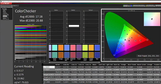 OLED在恒定亮度情況下,幾乎可以達(dá)到完美的DCI-P3色域覆蓋和驚人的色彩準(zhǔn)度。然而如果亮度在ABL介入下突然降低或突然經(jīng)歷巨大的波動,那么色彩準(zhǔn)度也會發(fā)聲較大變化。